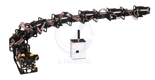 12自由度蛇形機器人產品采用鋁合金材料的關節結構,長約1m,重約1.5kg,12關節兩兩正交,配合PC上位機軟件,可以對各個關節進行精確定位,可形成連續的運動,做出各種復雜的動作,可實現仿生蛇的前進、后退、拐彎、蠕動、盤起、抬頭等多種動作。結合各種傳感器可以檢測光強、聲音、溫度等環境參數,也可以通過紅外傳感器實現避障、通過傾覆傳感器判斷是否跌倒或者安裝其他傳感器實現其他不同的功能。