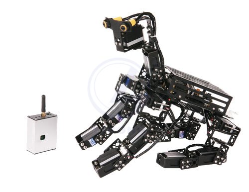 該產品采用鋁合金材料的關節結構,每條腿具有3個自由度,頭部2個自由度,尾巴一個自由度,共有15個自由度。配合PC上位機軟件,可以對各個關節進行精確定位,可形成連續的運動,做出各種復雜的動作,可以實現前進、后退、拐彎、搖頭、擺尾、倒立、招手等花樣動作。在此基礎上配備相應的傳感器,還可以使其具有一定的智能:可以檢測光強、聲音、溫度等環境參數,也可以通過紅外開關實現避障、通過傾覆傳感器判斷是否跌倒或者安裝其他傳感器實現其他不同的功能。