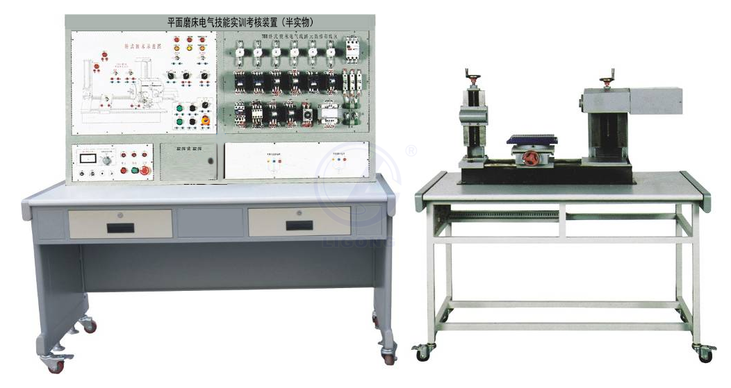 平面磨床電氣技能實訓考核裝置(半實物)由電源控制部分、機床電氣控制部分、半仿真機床實物部分構成。電源控制部分包括實訓定時、定時報警、安全用電自動控制等,機床電氣控制部分把整臺機床內部電器裝在正面面板上,能直觀地觀察機床工作時各電器的動作狀況。故障點在面板上設有相應測試點,供實訓考核者測試用。仿真機床部分能模擬機床各種運動。通過本裝置的實訓能使學員掌握機床常見故障的現象、故障產生的大概部位,熟練掌握機床電路工作原理,其是維修電工初、中、高級技能鑒定的理想設備。