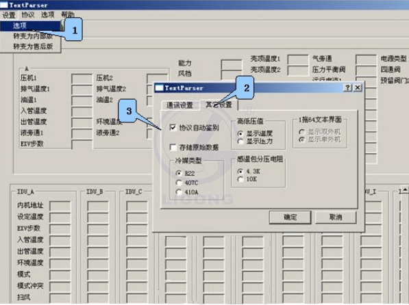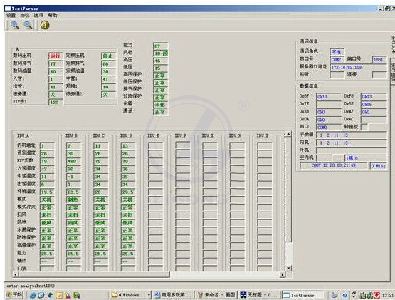 文本顯示界面:可測試壓縮機的運轉頻率,傳感器的各種數據,電子膨脹閥的工作步數等幾十種中央空調的工作數據和狀態,