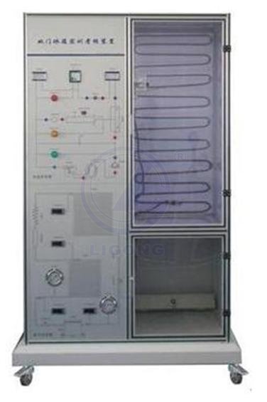 1.實訓柜:鐵質雙層亞光密紋噴塑結構,鋁質面板。制冷系統中加入了兩個電磁控制閥,用于直冷式與間冷式電冰箱轉換時切換不同的蒸發器,同時還可以完成制冷系統的故障模擬實訓。管路中設有視液鏡,便于觀察制冷劑的狀態。在實訓柜的底層設有一個柜子,用于放置實訓連接線、工具及其它實訓用品。冰箱門采用透明設計,便于觀察蒸發器表面結霜、結露情況,冷凝器外置于冰箱后面。