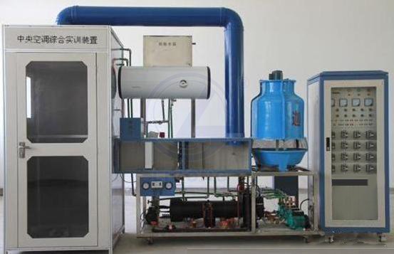 設備整體與實際中央空調系統結構相同,采用開放式不銹鋼框架結構,各部件布局合理操作方便。系統由制冷機組、冷卻水系統、冷凍水系統、制熱系統、空氣調節系統(風管組件)、模擬房間、電控柜、計算機等部分組成,并配有集水器、分水器、膨脹水箱。