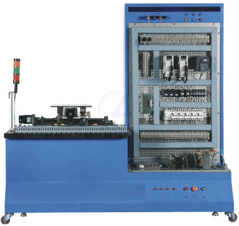 該裝置采用一體化設(shè)計,由底座、電氣柜、鋁合金導(dǎo)軌式安裝平臺組成,電氣柜正面裝有數(shù)控系統(tǒng)和操作面板,數(shù)控系統(tǒng)的下方安裝有四工位電動刀架、冷卻電機(jī)、主軸電機(jī)及編碼器等,背面安裝有網(wǎng)孔板,用以安裝變頻器、伺服驅(qū)動器、接觸器、繼電器、保險絲座、斷路器、開關(guān)電源、變壓器、接線端子排、走線槽等;鋁合金導(dǎo)軌式安裝平臺采用40x80規(guī)格的工業(yè)型材,上面安裝有十字滑臺和三色燈。