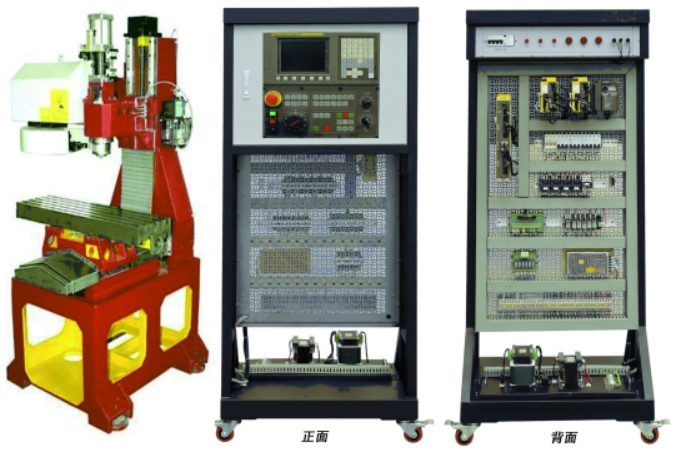 2.機床實訓(xùn)柜采用鐵質(zhì)亞光密紋噴塑結(jié)構(gòu),正面裝有數(shù)控系統(tǒng)和操作面板,背面為機床電氣柜,柜內(nèi)器件布局與實際機床廠的模式一致。電氣柜內(nèi)的電氣安裝板為不銹鋼網(wǎng)孔式結(jié)構(gòu),上面裝有主軸驅(qū)動器、伺服驅(qū)動器、交流接觸器、繼電器、熔斷器、斷路器、開關(guān)電源、接線端子排和走線槽等;電氣柜底部還設(shè)有變壓器和接地端子等。配套電氣元件均采用國內(nèi)外知名品牌,如施耐德公司的接觸器、歐姆龍公司的繼電器、臺灣明緯的開關(guān)電源、民揚的斷路器等。