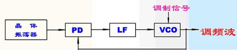 實(shí)現(xiàn)鎖相調(diào)頻的條件是調(diào)制信號的頻譜要處于低通濾波器通帶之外。使壓控振蕩器的中心頻率鎖定在穩(wěn)定度很高的晶振頻率上,而隨著輸入調(diào)制信號的變化,振蕩頻率可以發(fā)生很大偏移。這種鎖相環(huán)路稱載波跟蹤型PLL。