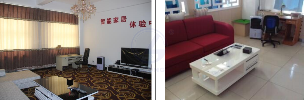 (7)家居裝修材料:采用現(xiàn)代居室裝修風格,將智能設(shè)備直接融入裝修中,按照家庭裝修方式鋪設(shè)電源線路、玄關(guān)處安裝總開關(guān),分出大門、玄關(guān)、客廳、臥室、廚房等區(qū)域,放置沙發(fā)、電視柜、櫥柜、木桌、茶幾、花圃等輔助設(shè)備。