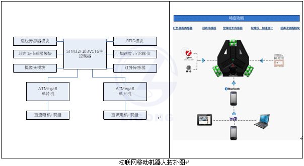 物聯網移動機器人教研平臺,是一款基于STM32方案推出的功能全面、性能卓越的物聯網智能移動平臺,能夠自主運行、自主規劃,支持手機控制平臺運動,集成了陀螺儀、巡線傳感器8路、6個紅外避障傳感器、超橫波測距模塊、RFID等多種傳感器,支持3G(智能手機)、WiFi、Bluetooth和Zigbee無線網絡以及RFID等通信方式,是一款性能穩定且功能強大的物聯網移動平臺。