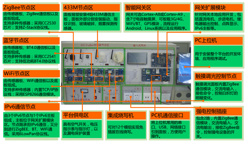 LGWL-WD01型 物聯網綜合實驗實訓臺是一款覆蓋各種主流無線通信技術與下一代互聯網技術、面向物聯網三個層次知識點的綜合實驗實訓平臺。平臺采用模塊化設計,包含 433M 探測區、ZigBee 傳感區、Bluetooth4.0 傳感區、 WiFi 傳感區、IPv6 傳感區、智能網關與網關擴展區、ZigBee 強電控制區、計算機通信接口以及電源供電區等。平臺傳感區集成了多達十六種傳感器節點,涵蓋433M/ZigBee/BT/WiFi/IPv6 各種無線傳感器網絡模塊與 ZigBee 強電控制模塊;網關采用 Cortex-A8(A9)處理器,具有 3G/4G 新一代移動互聯網通信模塊、以及GPS/北斗定位模塊。平臺提供無線傳感網絡協議、數據采集控制程序、網關 GUI 應用程序、數據庫管理程序、網絡監控等各種軟件資源,支持 PC 與 ARM 架構的二次開發與應用;具有詳細的硬件設計電路圖、豐富的實驗例程以及完善的實驗指導書,非常適合高校物聯網專業教學、實驗、實訓、科研開發。