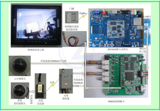 1、云臺攝像頭、普通監控攝像頭采集的視頻數據交替顯示在監控器上,嵌入式網關通過 ZigBee 網絡向 DSP 節點發送“屏幕開/屏幕關”命令,從而控制 DM642 視頻板卡,實現視頻顯示器的開、關。