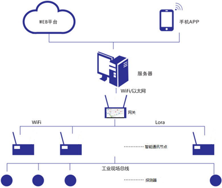 由空氣質量傳感器、粉塵傳感器、噪音傳感器、智能通信節點等組成,具有空氣質量監測、揚塵監測、噪音監測功能。智能通信節點與網關互聯互通,上報環境監測數據,通過網關發布到云平臺展示。