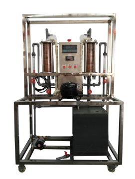 采用透明耐壓玻璃作殼體的壓縮機、盤管蒸發器、盤管冷凝器。循環水泵,玻璃轉子流量計,調節閥門組、PVC板冷卻水箱;測試系統由8路萬能信號輸入液晶顯示巡檢儀、PT100熱電偶組成;有工作臺架可隨時移動。