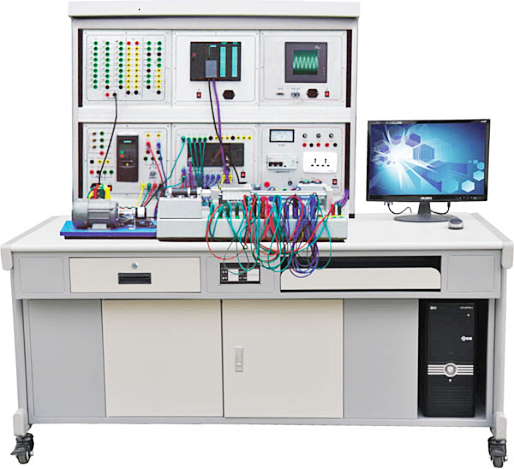 7、實驗臺操作面板: PLC和變頻器的輸入輸出點均引到實驗臺面板上,采用高絕緣的安全型插座及帶絕緣護套的高強度安全型實驗導線,方便實驗接線。包括各種按鈕、指示燈、繼電器等,配置電位器,可模擬傳感器的輸入信號,方便學生自行設計實驗。