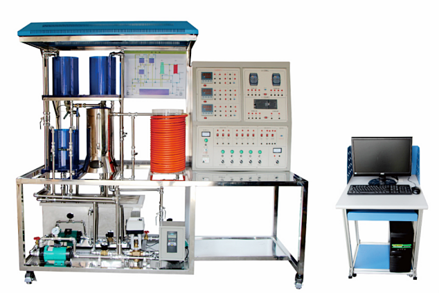 過程控制包括一組有機玻璃三(兩)容水箱,每個水箱裝有液位傳感變送器;同時具有兩路供水系統,一路由進口動力水泵、調節閥、電磁流量計組成,另一路由變頻器、進口動力水泵、渦輪流量計組成,通過閥門切換,任何一組供水可以到達任何一個水箱。另外,為實現溫度控制,該實驗裝置專門設計了一只由帶夾套鍋爐、防干燒裝置組成的常壓電加熱鍋爐。鍋爐分內膽和夾套兩層,內膽由電加熱器提供熱源,由一路供水系統提供水源,鍋爐內膽裝有防干燒裝置來確保設備安全;夾套由一路供水系統提供冷卻水。通過改變電加熱器的加熱功率或冷卻水/待加熱水的流量來影響內膽水溫和夾套水溫。鍋爐內膽和夾套均安裝有熱電阻測溫元件。