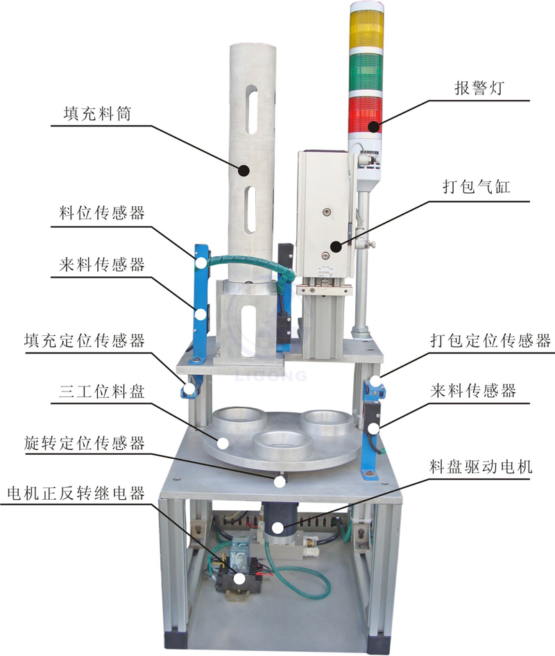 單出桿氣缸3只,金屬傳感器1只,光傳感器2只,磁性開關(guān)6只,物件導(dǎo)槽3個(gè),單控電磁換向閥3只,氣缸和電磁閥均采用日本SMC | 1套 |