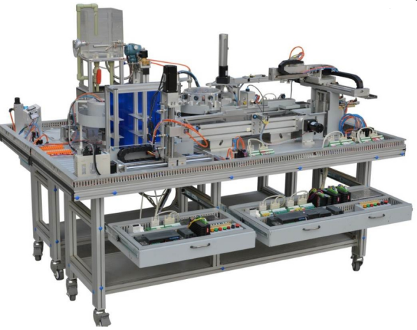 系統(tǒng)由鍵盤抽屜、電腦桌、主桌體、觸摸屏模塊、、掛箱抽屜、包裝蓋章單元、桌面接口線路板、立體倉庫單元、執(zhí)行機構(gòu)線路板、氣源三聯(lián)件、轉(zhuǎn)盤上料單元、加熱與檢測單元、1#輸送帶模塊、灌裝加蓋單元、2#輸送帶模塊、3#輸送帶單元、機器人搬運單元等組成。