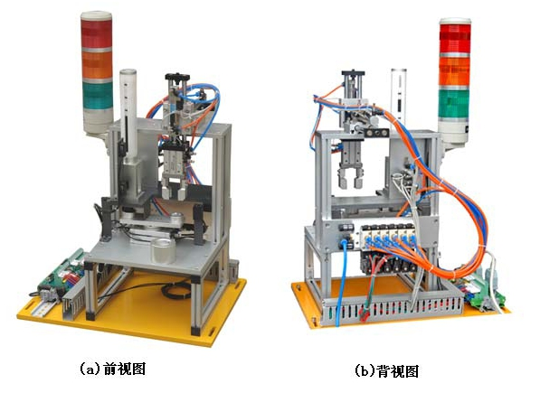 主要由井式供料單元、三工位旋轉工作臺、平面軸承、沖壓裝配單元、光電傳感器、電感傳感器、磁性開關、電磁閥、直流電機及驅動繼電器、支架、機械零部件構成。