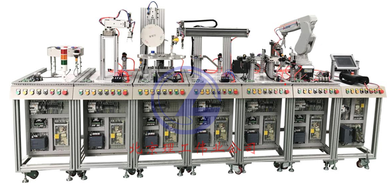 所有單元機械裝置整體安裝在底板上,底板固定在獨立的鋁合金導軌式實訓桌上。工作單元都可自成一個獨立的系統,同時也可以通過網絡互連構成一個分布式的控制系統。單站模式命令和狀態指示由本地按鈕指示燈模塊給定和顯示。整機模式命令給定和狀態指示由觸摸屏給出和顯示。警示燈指示整機運行、停止、復位、報警等狀態信號。