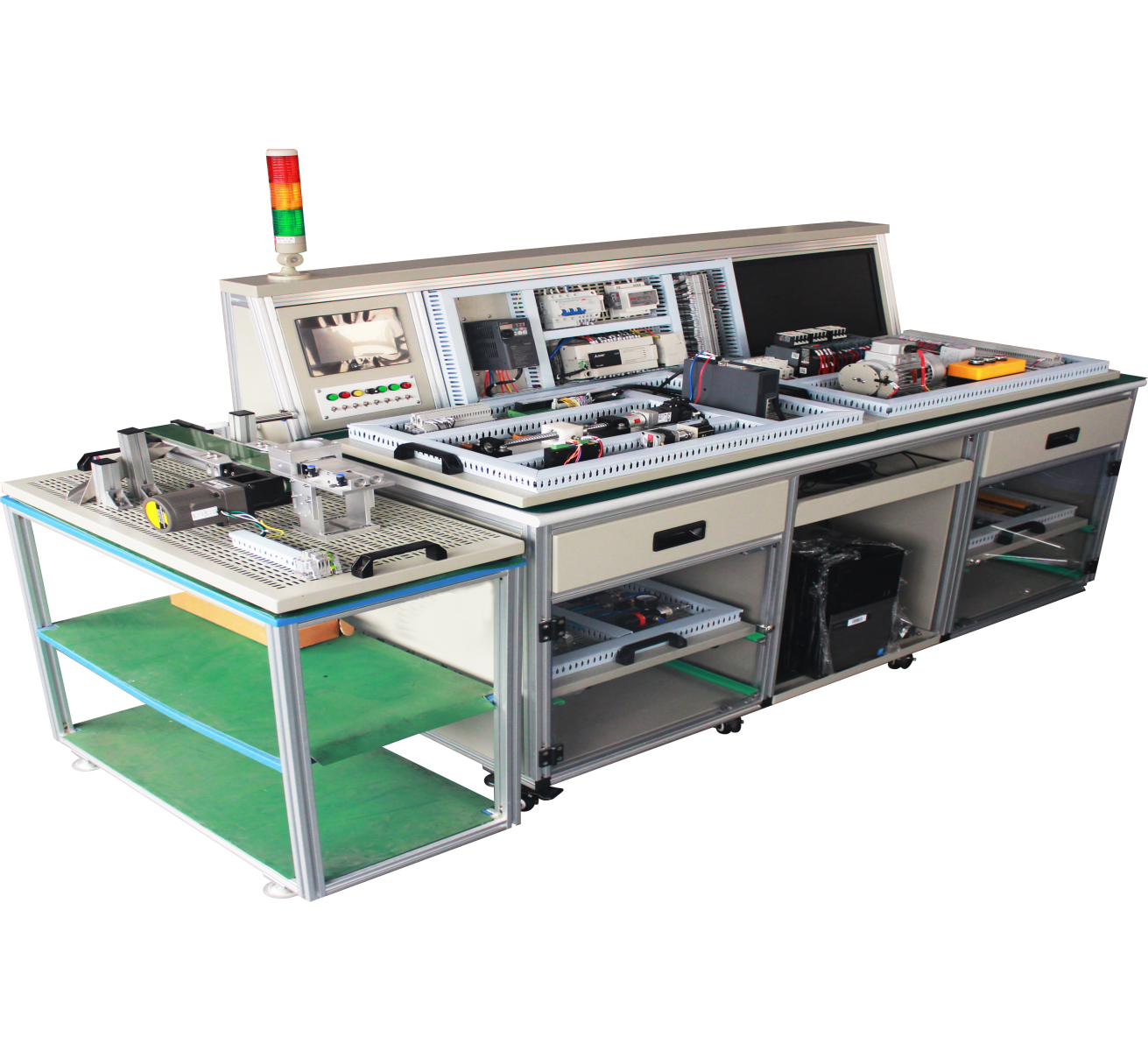 | 1 | 主模塊(PLC、變頻、觸摸屏) | 30X30工業(yè)鋁型材臺架,1600X800X1200配腳輪。 輸入電源:三相AC380V±10%; 整體功率:<0.6kVA; 氣源壓力:≥0.4MPa; 工作溫度:-5ºC~+40ºC; 工作濕度85%(25ºC); 整機重量:≤120Kg 由三菱FX3U-48MT,三菱變頻器,三相異步電機,7寸維綸觸摸屏,三菱cclink通訊模塊,臺式電腦、按鈕盒等組成 |