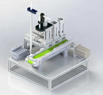 2、自動上料模塊:該模塊由料倉、氣缸、傳送帶、視覺、定位臺組成。自動上料機可以上三種形狀(圓形、方形、矩形)的物料,每種物料又分兩種顏色(藍色、紅色),選手通過視覺系統識別物料形狀與顏色來分類物料。