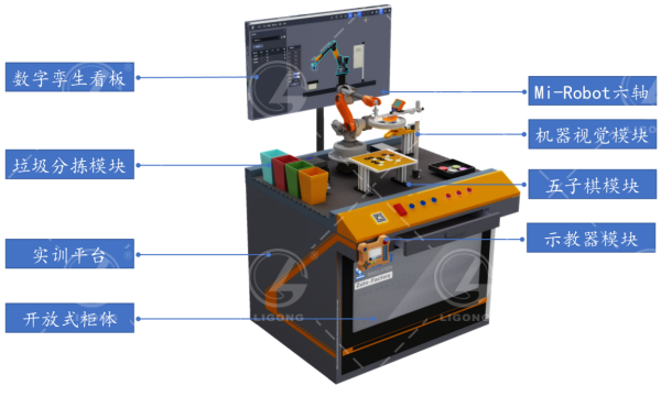 該系統包含了機器視覺控制系統、機器視覺仿真系統、六軸機器人、工控機系統以及3D數字孿生系統,該平臺采用模塊化方式組成,并配套數字化看板和實訓臺,形成對機器人的高級集成和綜合應用的實訓仿真平臺。