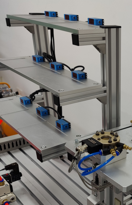 4、立體倉庫:存儲自動裝配工件;倉位數量:≥3列3層9個;倉位承重:≥2Kg;倉位尺寸:≥100mm×70mm×80mm;外形尺寸:≥350mm×180mm×450mm;工件種類:≥3種9個;工件模塊包括自動裝配母件、子件等。