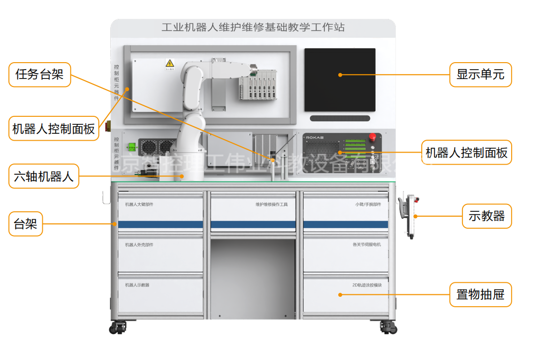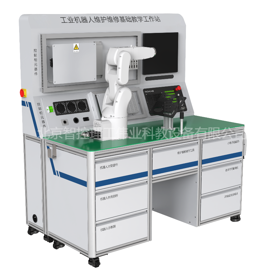 工業機器人維護維修基礎教學工作站,以工業機器人本體及其控制系統最常見維護維修操作為核心,通過對典型故障的診斷和排除,按照規范步驟完成對工業機器人本體的拆裝過程,并根據圖紙要求搭建控制系統并接線,由零件級深入了解工業機器人的構成形式和運動方式,掌握基礎維護維修技能。工作站配套了與生產廠家完全相同的工裝、工具,讓學生可以在教學環境中充分體驗高精度機電設備的生產工藝要求,確實掌握維護維修技能。