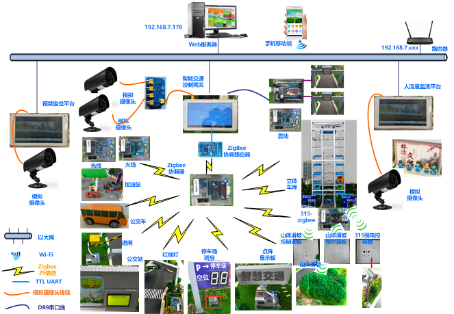 2.主體支撐采用一個鋁合金金屬骨架和鈑金墻壁圍繞組成,便于拆卸、組裝。 3.模型臺面采用OrCAD設(shè)計城市交通規(guī)劃圖鋪設(shè),含有景觀面板、城市道路、十字路口、交通燈、路燈、防護(hù)林、園區(qū)、加油站、停車場、橋梁等模擬景觀,與智能網(wǎng)關(guān)、交通狀況感知控制節(jié)點、智能車、攝像頭、控制中心以及對應(yīng)的應(yīng)用軟件一起,構(gòu)成完整的智能交通實訓(xùn)系統(tǒng)。 4.具有交通指示燈、交通照明控制、智能道閘、ETC收費、智能公交站臺(自動播報、到站顯示)、災(zāi)害預(yù)警等智慧交通控制系統(tǒng)。 5.具有公交信息操作展示平臺,統(tǒng)一處理所有數(shù)據(jù),集中查詢和監(jiān)測。 6.具有立體車庫系統(tǒng)。 |