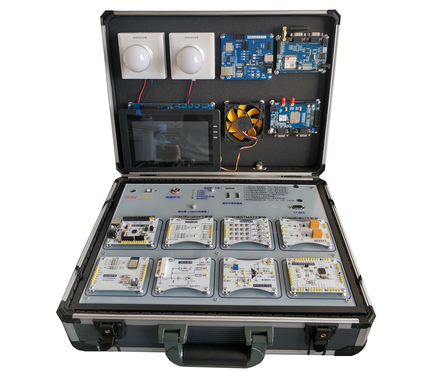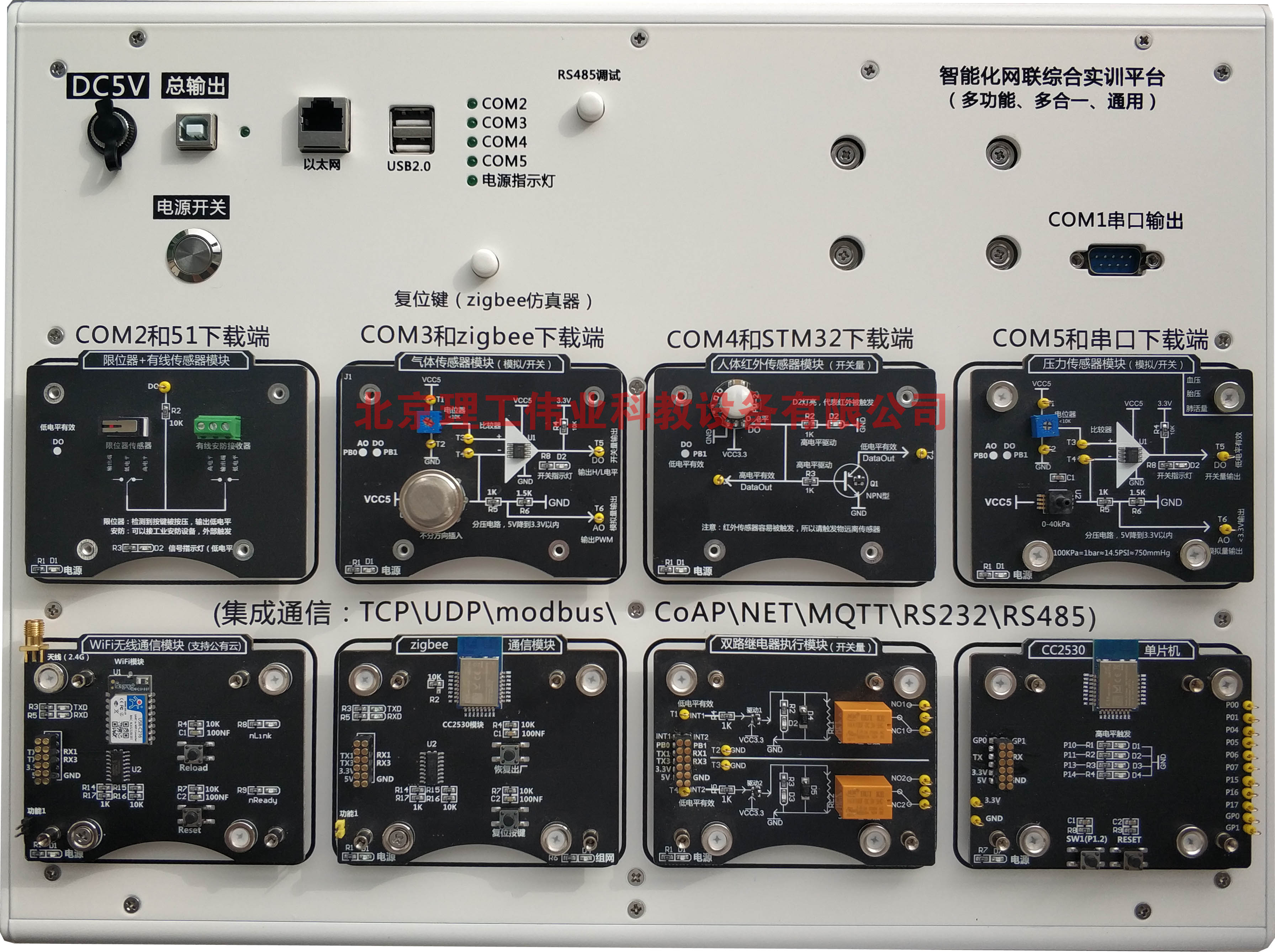 7、實(shí)驗(yàn)?zāi)K可選:嵌入式 STM32 處理器、RFID(LF 低頻、HF 中頻、UHF 超高頻)、2.4G 有源讀寫(xiě)模塊、雙路繼電器、CC2530 單片機(jī)、照明燈模塊、雙路風(fēng)扇模塊、集成調(diào)試底板、攝像網(wǎng)關(guān)模塊、攝像云臺(tái)(帶攝像頭)、智慧平衡車(chē)主板、門(mén)禁控制主板、4-20mA 工業(yè)傳感器控制模塊、鍵盤(pán)采集模塊、虛擬儀器采集模塊、紅綠燈模擬器模塊、數(shù)碼管顯示器模塊等;