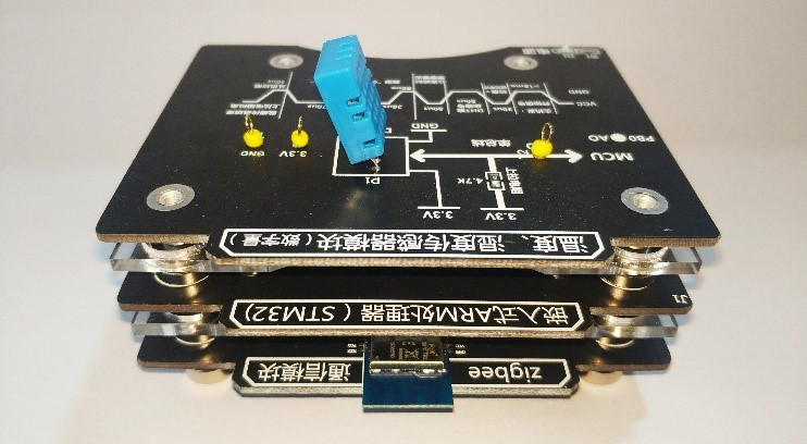 8、模塊均采用磁吸式接口設(shè)計(jì)+搭積木式結(jié)構(gòu),集成標(biāo)準(zhǔn)的 12 路彈性插針,可以實(shí)現(xiàn)供電、仿真調(diào)試、數(shù)據(jù)通信、IO 口拓展等功能,同時(shí)支持搭積木式的多級(jí)磁吸聯(lián)接,通過(guò)彈性插針即可通信,無(wú)須外接跳線, 通過(guò)模塊相互搭積木,組成一套完整的物聯(lián)網(wǎng)系統(tǒng),如:STM32 處理器+ZigBee 無(wú)線模塊+傳感器模塊(3 層垂直積木,無(wú)須額外接線),可拓展性強(qiáng),如下圖所示: