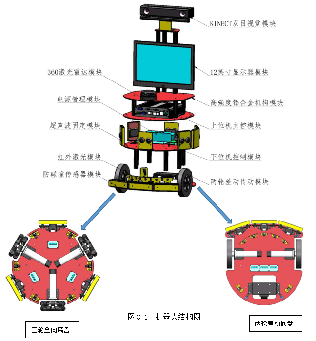 如圖3-1 機器人結構圖所示,組裝后的機器人分為4層,*底下一層為運動底盤,可以有履帶,兩輪差動,三輪全向可供選擇,第二層為下位控制層,第三層為上位機控制層,第四層放置二維激光,kinect等傳感器。