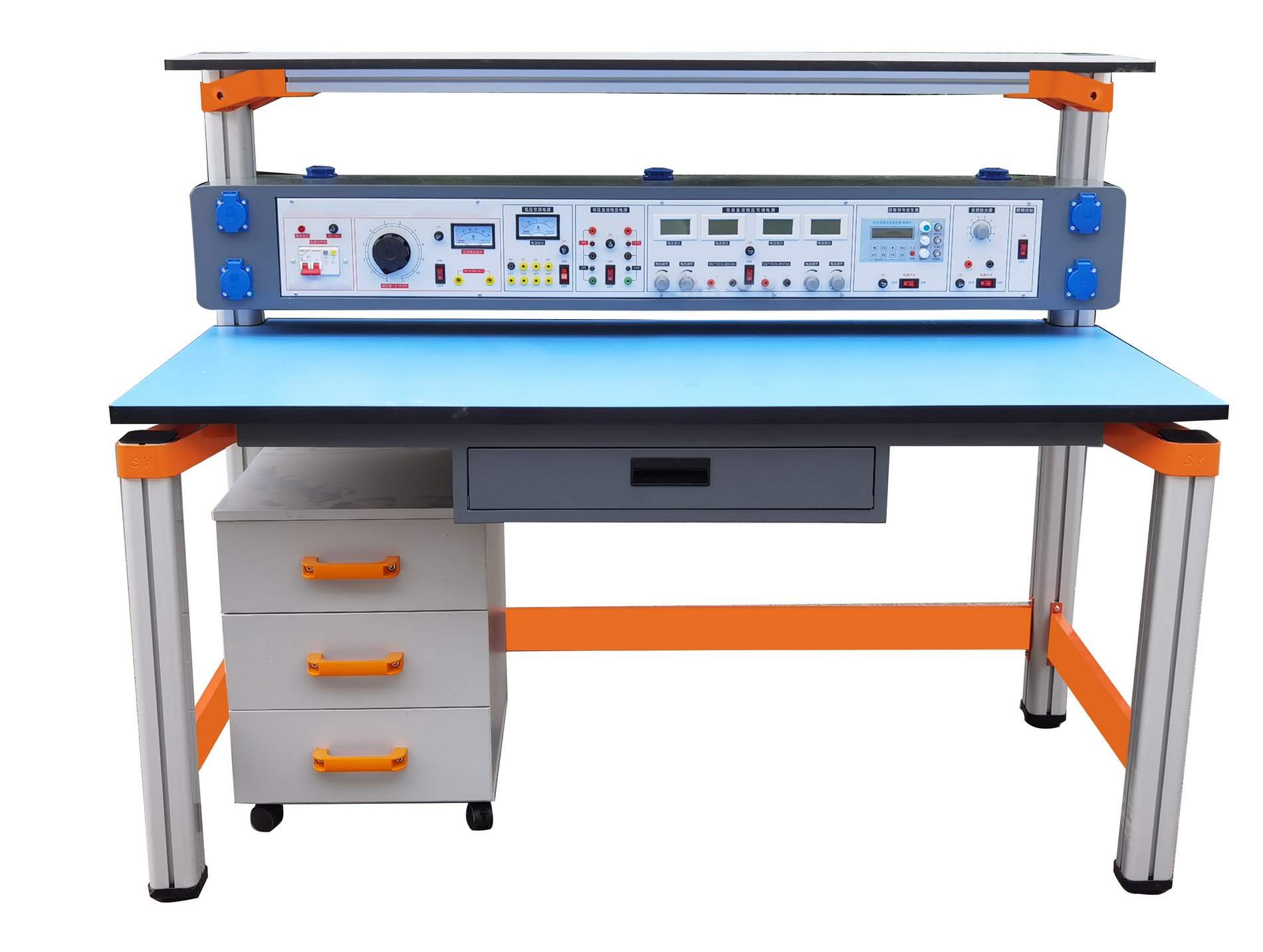 2、實(shí)驗(yàn)操作桌:雙面飾面板制成,不變形不褪色,尺寸:160×70×80cm,造型美觀大方,中間設(shè)有抽屜,存放工具,左右二只存放柜,用于儲(chǔ)存元器件。