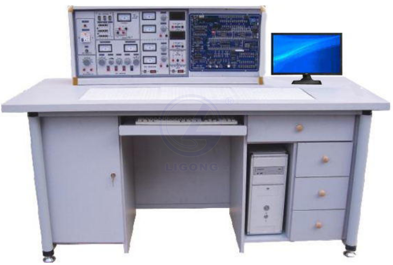 一桌為二座,桌面中央設置通用電路插板,元件盒在其上接插成實驗電路完成實驗。桌子左右各有一個柜,柜中存放元器件、貯存板及電腦,中間上層放置鍵盤、