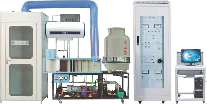 2、系統設備配置:設備整體與實際中央空調系統結構相同,采用開放式不銹鋼框架結構,各部件布局合理操作方便。系統由制冷機組、冷卻水系統、冷凍水系統、制熱系統、空氣調節系統(風管組件)、模擬房間、電控柜、計算機等部分組成,并配有集水器、分水器、膨脹水箱。