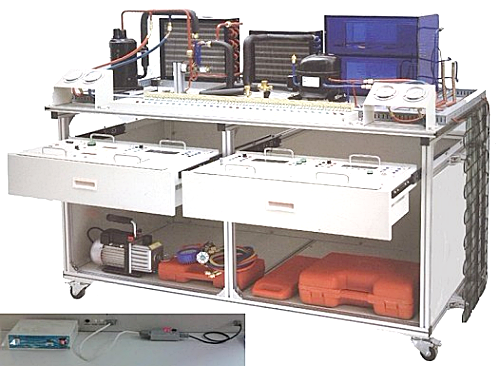 鋁合金實訓臺,空調制冷系統管路1套、直冷電冰箱制冷系統管路1套、安全插端子排,壓力表(1.8MPa)2只(3.8 MPa)2只等