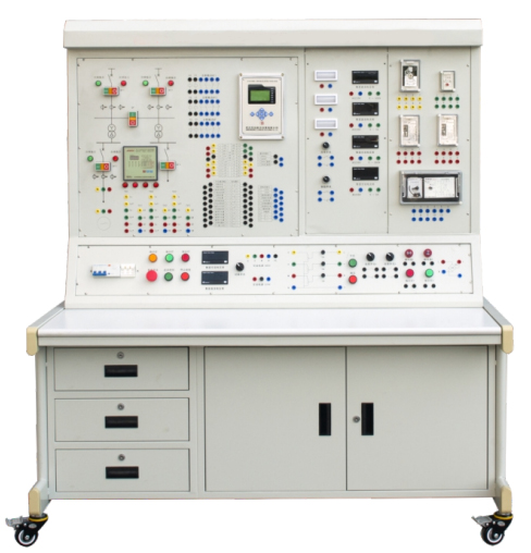 實驗臺由電源控制屏、10kV/0.4KV一次系統主接線、功率因數自動補償裝置、PLC、微機備自投裝置、實驗接線端子區、實驗模塊掛放區等七部分組成。