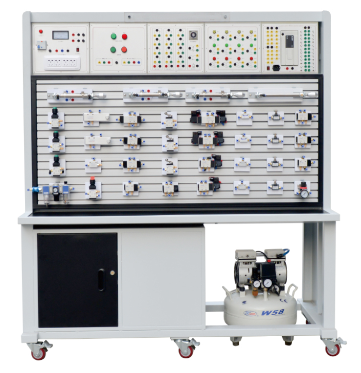 本實(shí)訓(xùn)裝備,由氣動元件部分、電氣控制部分及實(shí)訓(xùn)臺架等組成,電氣部分主要由PLC模塊、繼電器模塊、電源模塊、按鈕模塊等部分組成。實(shí)訓(xùn)臺主體框架采用鋁木結(jié)構(gòu)組裝完成,臺架重量較輕且安裝了萬向輪,可方便實(shí)訓(xùn)臺的移動。臺架分上下兩層結(jié)構(gòu),上面可放置電氣模塊,下面是實(shí)訓(xùn)屏,實(shí)訓(xùn)屏采用帶槽鋁合金結(jié)構(gòu),方便各氣動元件的安裝和拆卸,學(xué)生可以根據(jù)實(shí)驗(yàn)需要在實(shí)訓(xùn)屏上任意搭建氣動回路,組成具有一定功能的氣動系統(tǒng)。實(shí)訓(xùn)臺采用模塊式結(jié)構(gòu),便于組合與擴(kuò)展,提高了設(shè)備空間的利用率。