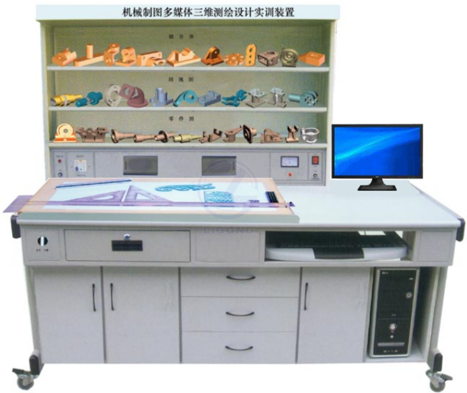 本公司首創研制開發,集設計、測繪、創新于一體的LG-FZ07型 機械制圖多媒體三維測繪設計實訓裝置,適用于《技術制圖》、《機械制圖》、《工程制圖》等課程。《機械制圖》是高職高專機械類專業學生必修的一門專業技術基礎課。是培養學生正確識讀和繪制機械圖樣,增強學生工程基礎能力,實踐性較強的應用型設備。同時,借助于計算機圖形學技術和多媒體技術,采用機械制圖多媒體軟件用電腦演示三維動態模型,加強直觀性教學,做到教學內容直觀形象,提高學習興趣、降低學習難度。還采用繪圖板來畫圖,制圖板的上下升降采用電動控制;實訓裝置采用36件模型供學生使用。