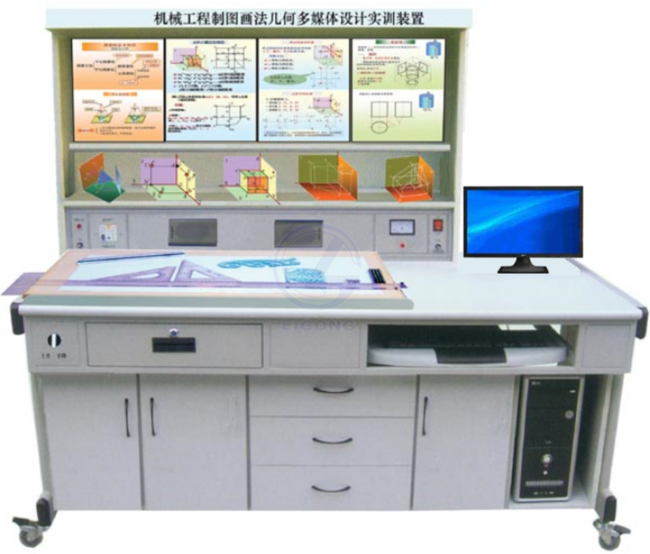 本公司首創研制開發,集設計、測繪、創新于一體的LG-FZ08型 機械工程制圖畫法幾何多媒體實訓裝置,適用于《機械制圖》、《畫法幾何》等課程。主要目的是培養學生繪制和閱讀工程圖樣的能力以及幾何形體的設計能力;同時培養和發展學生的空間想像能力和分析能力。采用畫法幾何多媒體軟件用電腦演示投影的產生和畫圖步驟的過程,多媒體軟件包含30件幾何模型動畫內容和畫圖步驟;還采用繪圖板來畫圖,繪圖板的上下升降采用電動控制;采用30件幾何體投影模型和30塊模塊板說明供學生使用;模型和模塊板可隨課程內容需要進行更換操作。
