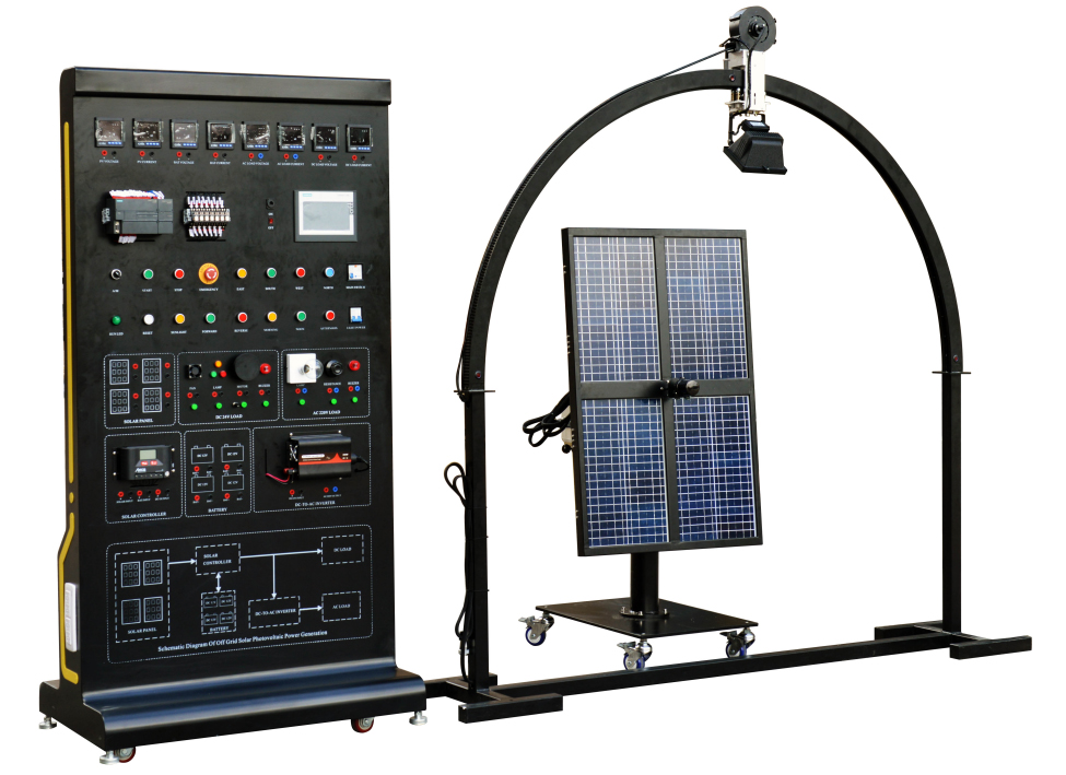 傳統的太陽能發電技術主要為太陽能電池板以固定的角度安放在地面上,這樣使太陽能電池板的轉換效率大大的降低。而我們根據太陽運動軌跡應用PLC控制系統、光學傳感器和直流電機系統實現了太陽能電池板的追日。使太陽能電池板始終與太陽入射光線成90°夾角,實現太陽能電池板的效率最大化。為了使學生能充分的學習新技術、了解當前新能源科技的發展前沿。我公司結合當前太陽能發展情況和未來的發展方向研制出了新型的太陽能發電設備:太陽能光伏發電綜合實訓系統。