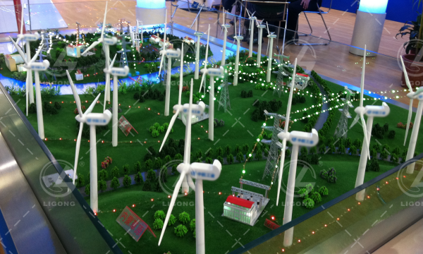 風電場模擬動態沙盤:大型風電場布局比例設計;模型整體布局為沙盤式,沙盤上布局20個小型風力發電機模型,各風機布局為錯開式布置。風機電動演示,設置升壓站,輸電鐵塔、辦公樓等設施風機、升壓站、輸電線路、場區環境,風機電動演示。