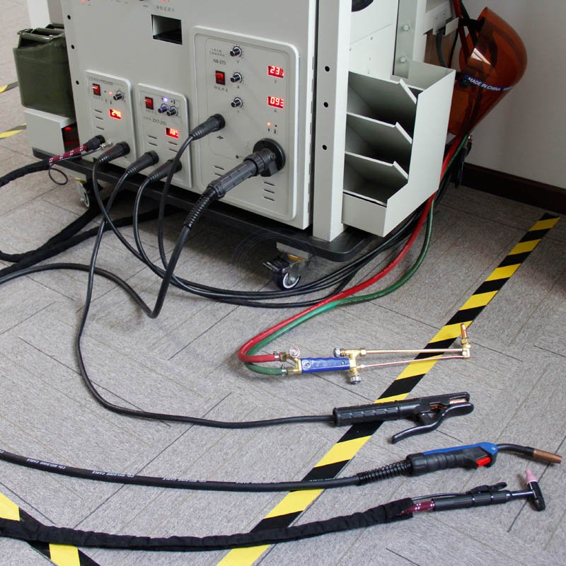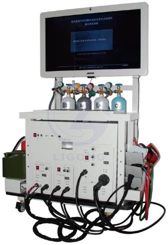 四種焊接(割)設備、及三種滅火器都集成在設備上,統一管理,分類操作。設備上的二氧化碳焊機、氬弧焊機、電焊機、相關氣瓶及儀表與真實設備一模一樣,操作者考試時需要根據真實焊接時的要求調節設備(比如開氣瓶,調節電壓,電流等)。