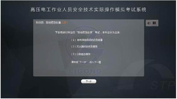 系統軟件功能豐富、合理、創新,該考試系統軟件是根據大綱里所列舉的考點及評分權重來設計的,考試內容100%符合大綱要求的考點。考試內容包含4個科目,科目一(安全用具使用)、科目二(安全操作技術)、科目三(作業現場安全隱患排除)、科目四(作業現場應急處置)。