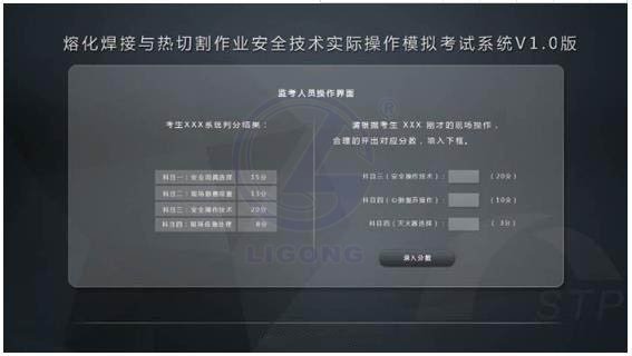 智能化、人性化程度較高,考生根據考核流程完成考試操作,系統根據《熔化焊接與熱切割作業安全技術實際操作考試標準》內的評分標準,自動對考生操作進行評分。然后可即時打印出成績單。