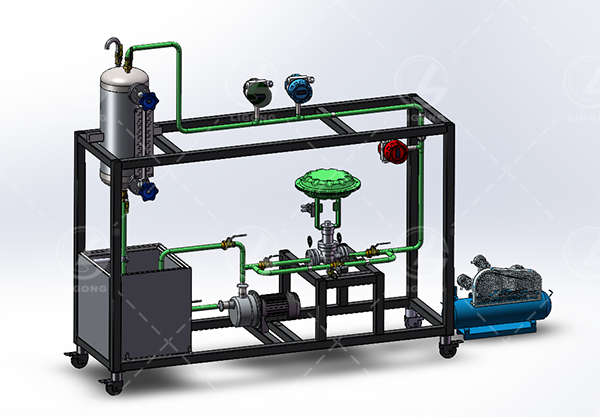 整套裝置由鋼制安裝框架、水箱、鍋爐、循環水泵、調節閥、空氣壓縮機、儀表、就地計算機操作臺、就地智能儀表控制上位監控軟件、外置配套設備等組成,工藝路線簡潔清晰,現場儀表與通訊模塊有機結合,上位計算機控制,設置DCS界面及自動評分系統。
